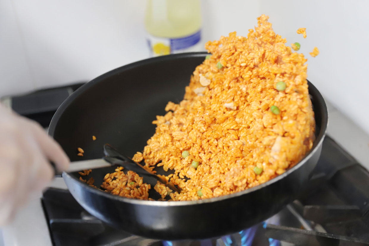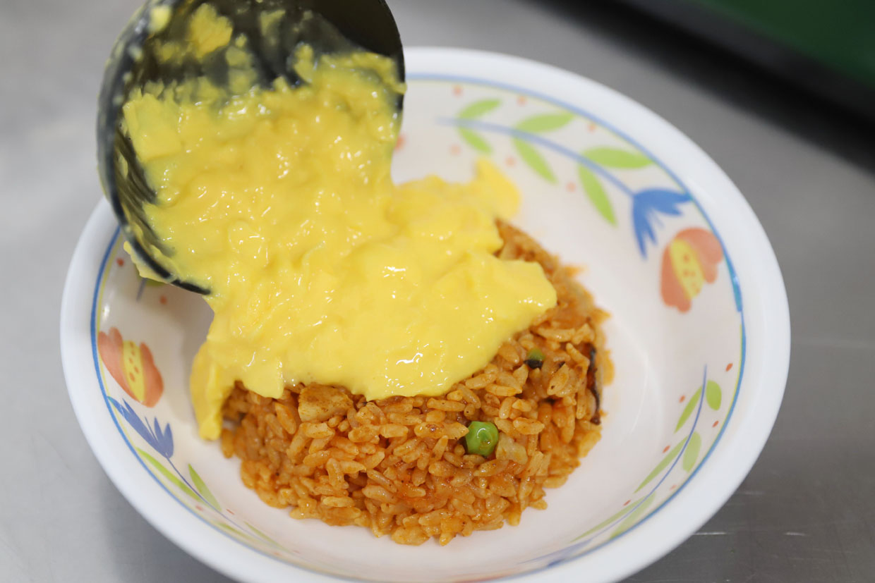 ケチャップの酸味と甘みが美味しいチキンライスにふわふわとろとろのタマゴを乗せました。