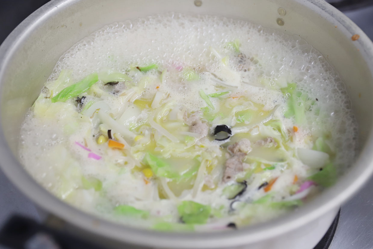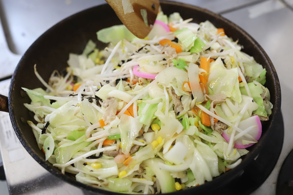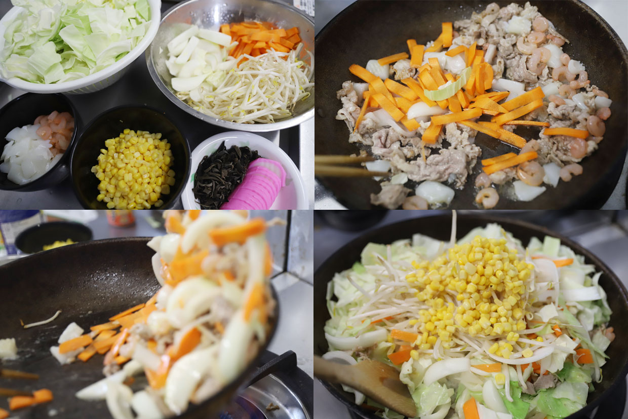 具材はキャベツ・玉ねぎ・ニンジン・もやしの野菜以外にも豚肉・海老・イカ・キクラゲ・かまぼこ・コーンと豪華バージョン。