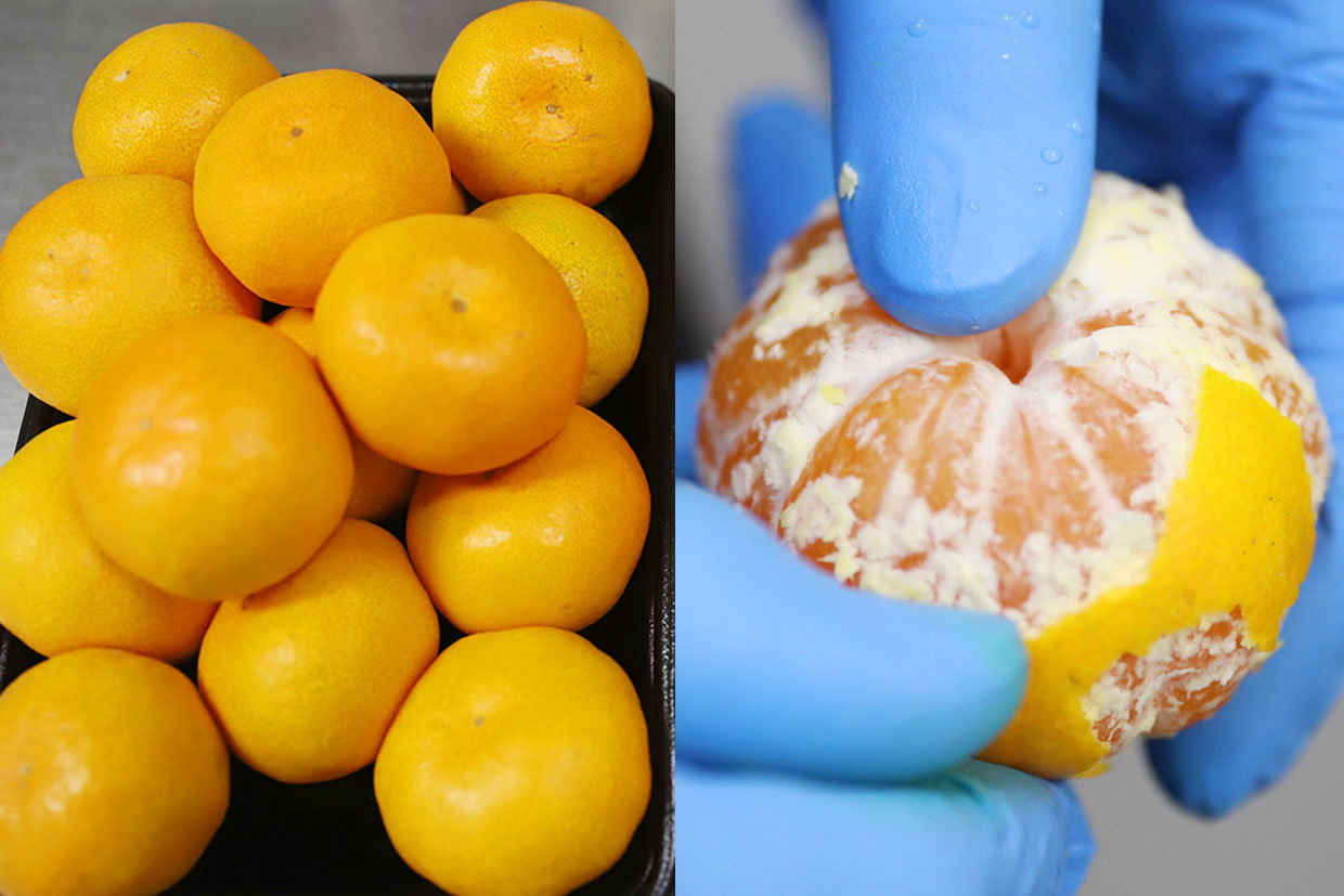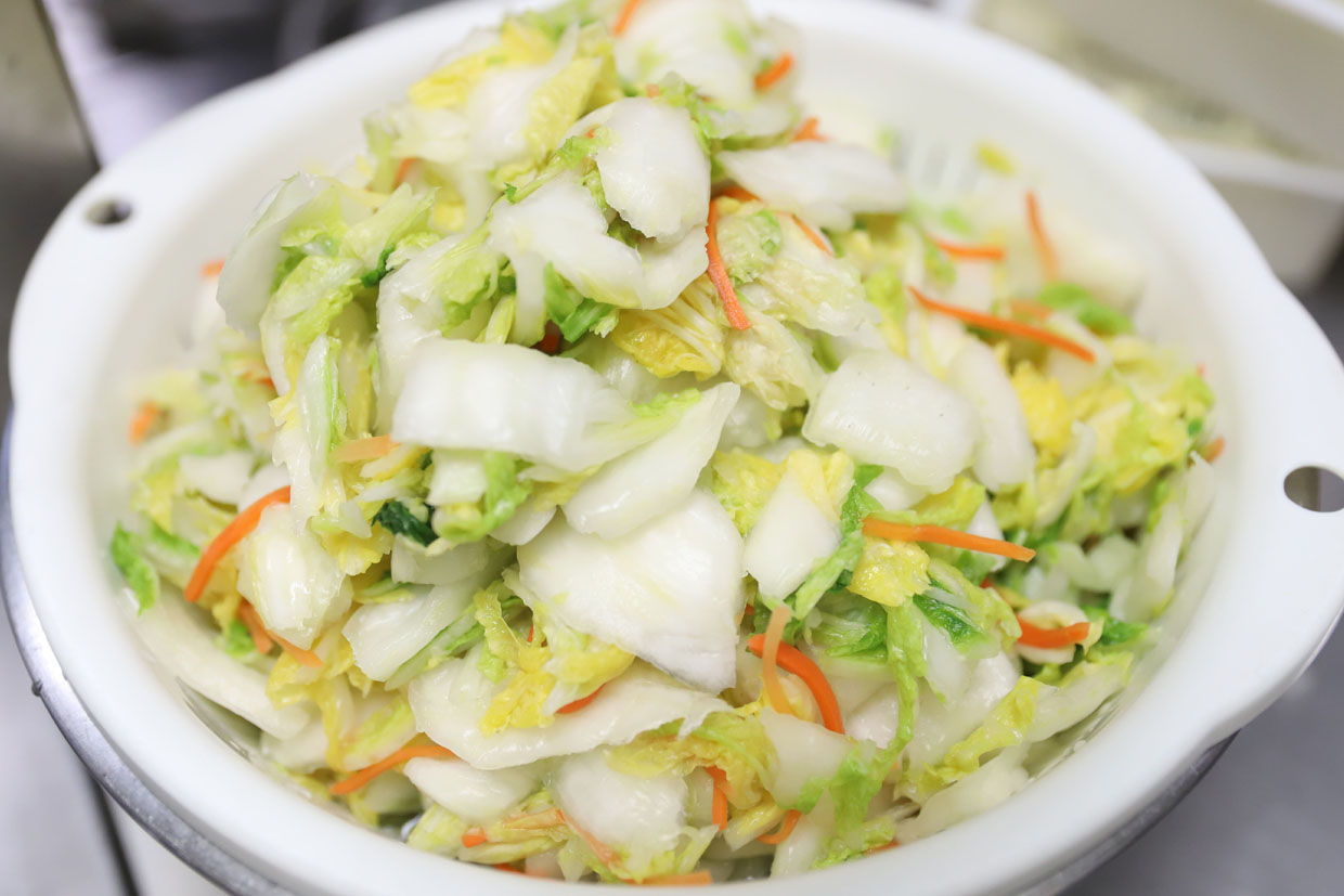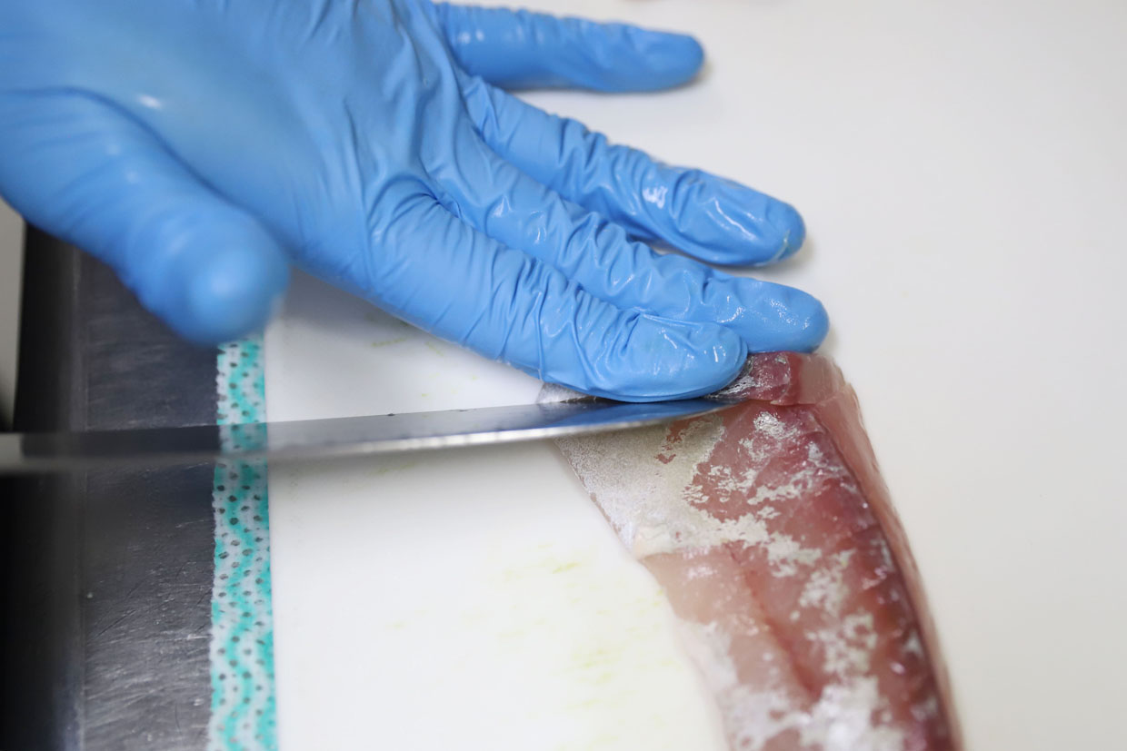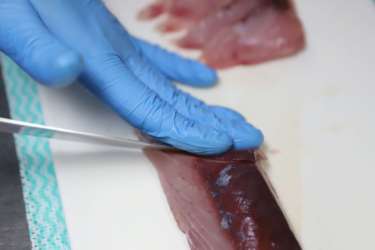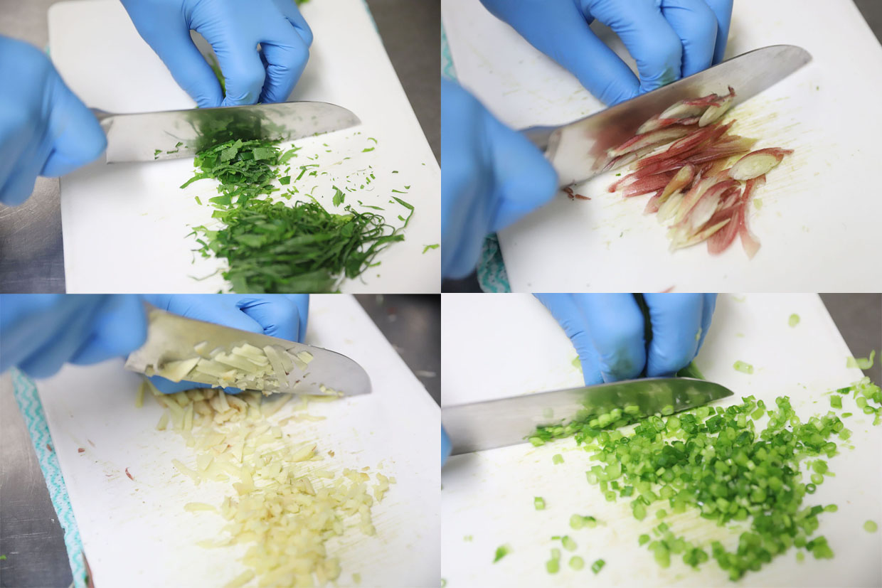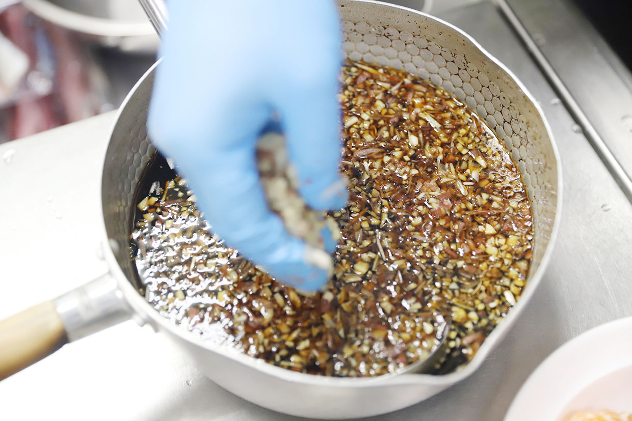 「はまち」と「カンパチ」を食べやすい大きさにカットし、ミョウガ・しょうがを加えたタレにつけ込みます。