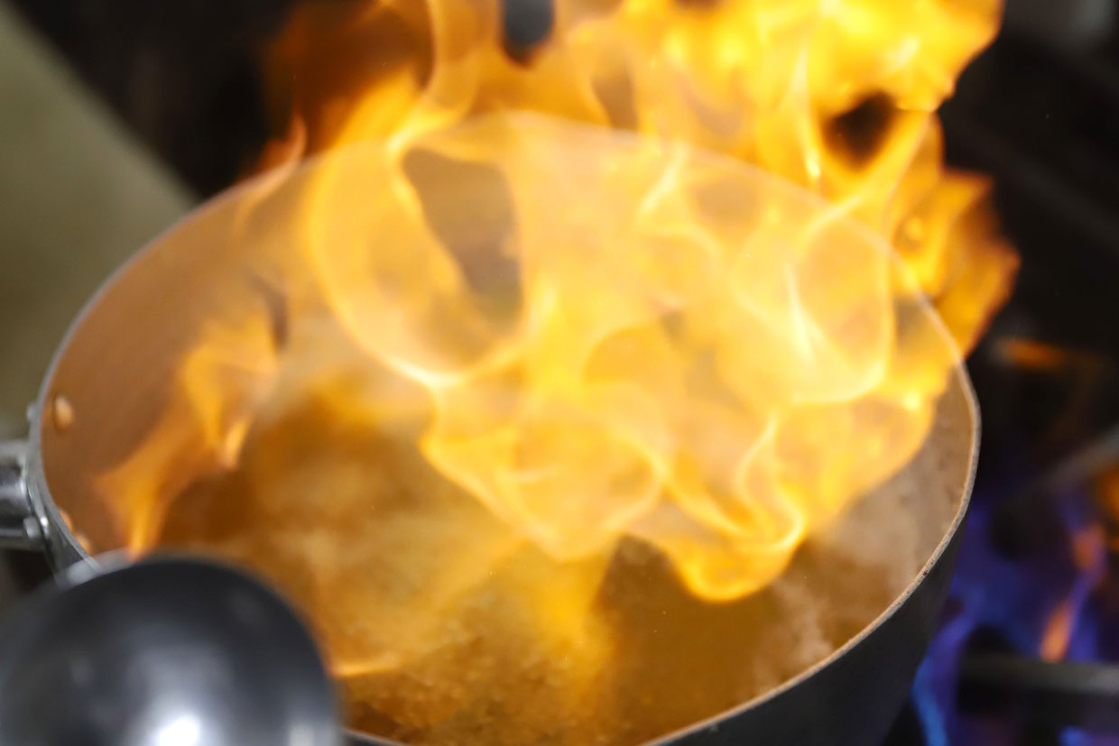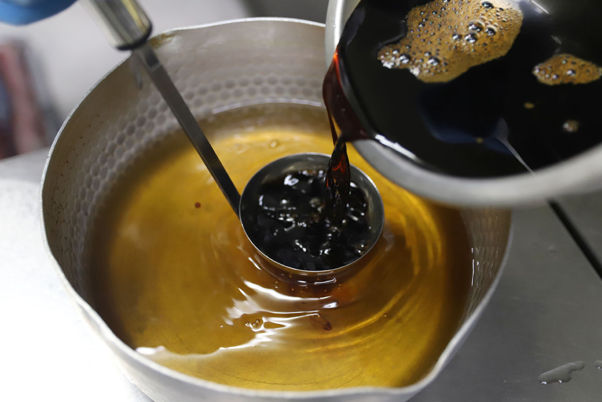 まずはザラメ、そこに酒・みりんを加え、火にかけアルコールを飛ばします。