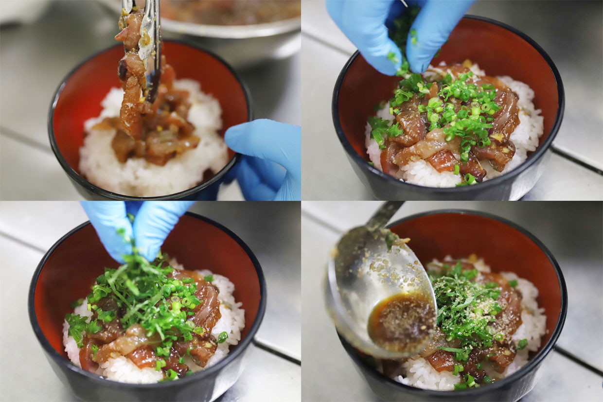 少し寝かしたのちに丼によそった熱々ご飯の上に盛り付け、仕上げに大葉と小口ネギを乗せて完成です。